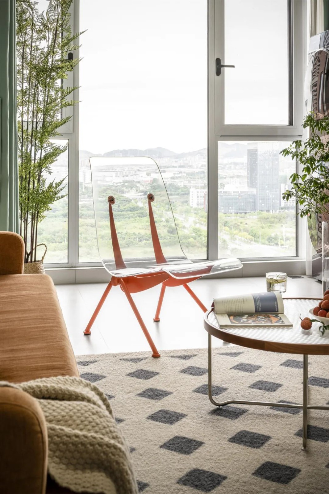 休閑陽臺做了封窗, 把陽臺面積都擴充到客廳, 地面延著客廳通鋪了水泥磚, 材質(zhì)統(tǒng)一視覺上有放大空間的效果。 沙發(fā)旁搭配了設計感很強的單人位, 亞力克+金屬搭配簡約輕盈, 透明材質(zhì)也保留了通透感, 絲毫不遮擋窗外的綠景。