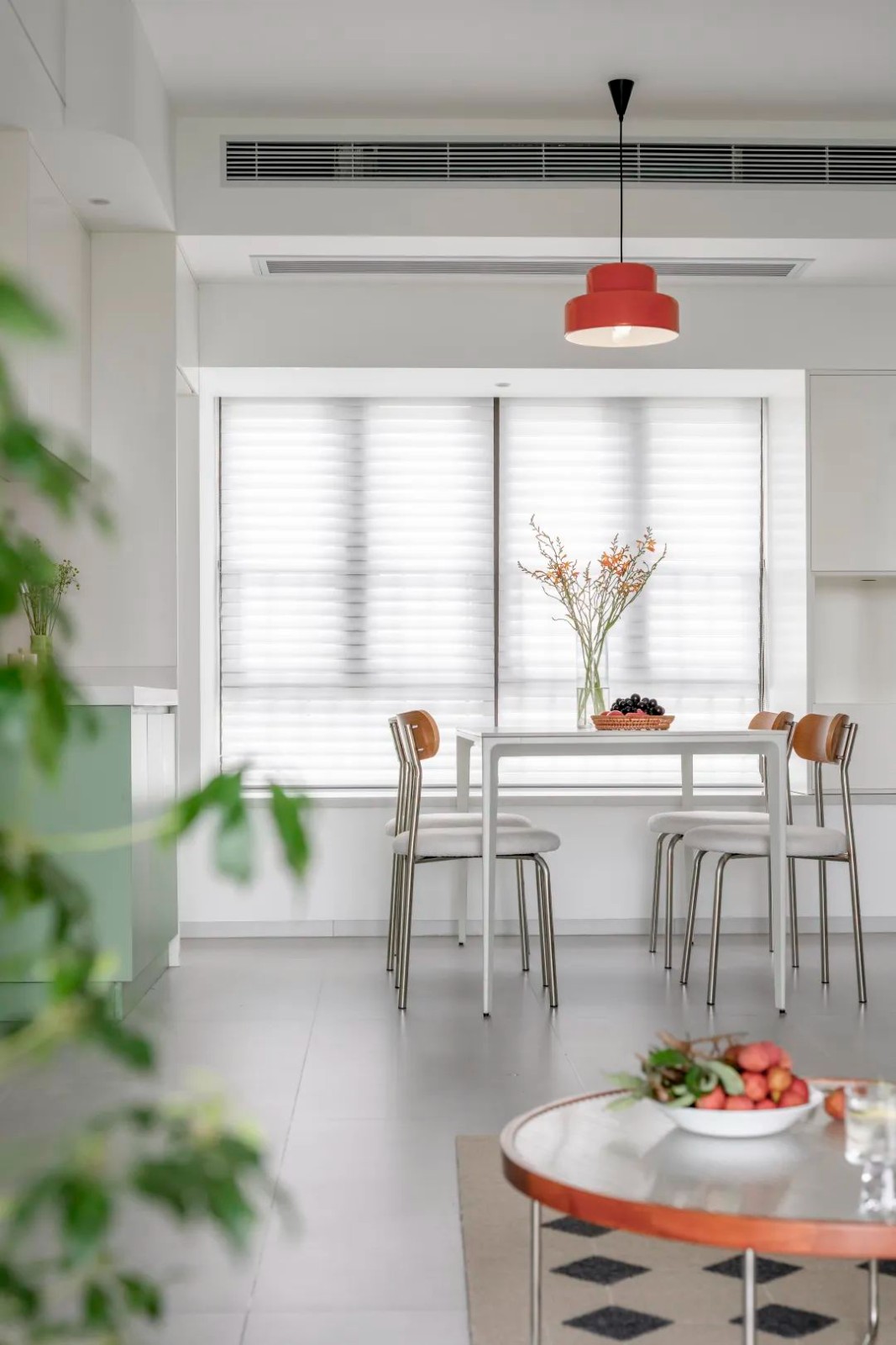 餐廳是純凈輕盈的白色基調(diào), 活潑的橘色吊燈為點綴。 利用飄窗的位置還做了一個高柜, 增加餐廚區(qū)域的收納空間, 中間預留了嵌入式烤箱的位置。