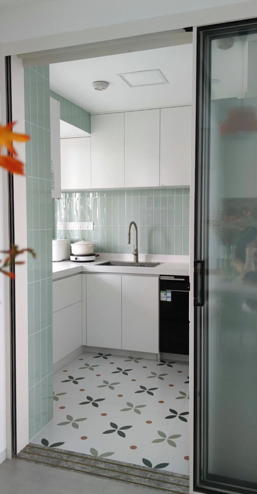U字型廚房是清爽的小清新風格, 定制櫥柜整體是統(tǒng)一的白色, 墻面是清涼的淺綠色墻磚。