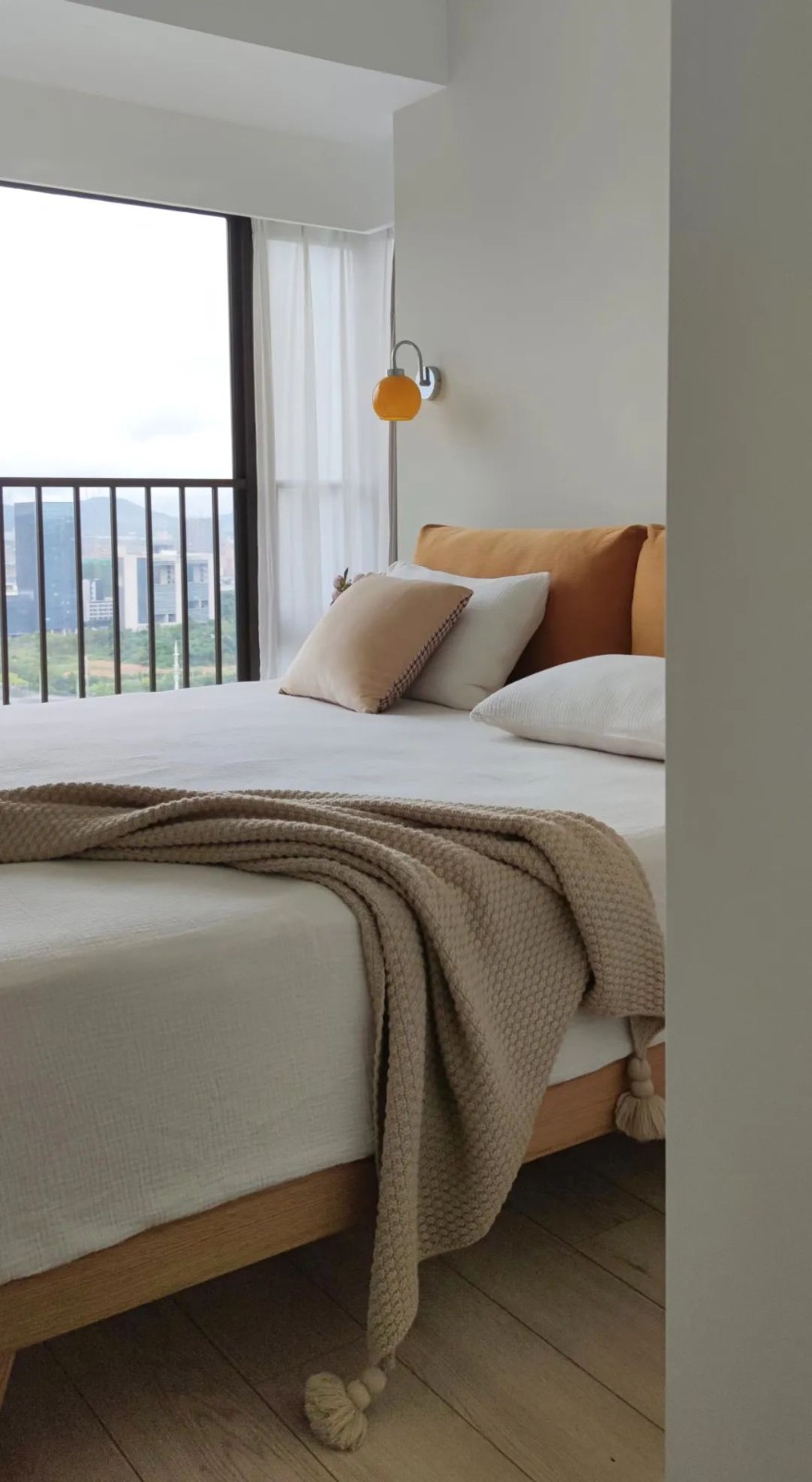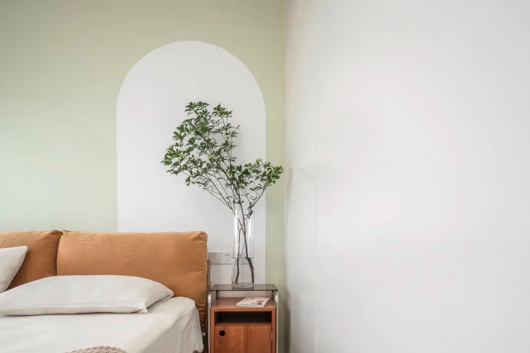 主臥床頭背景與客廳相互呼應, 主色調(diào)也是清爽的奶綠對撞暖橘色。 奶綠色背景墻里加了白色拱形元素, 增加空間的層次感和元素呼應,