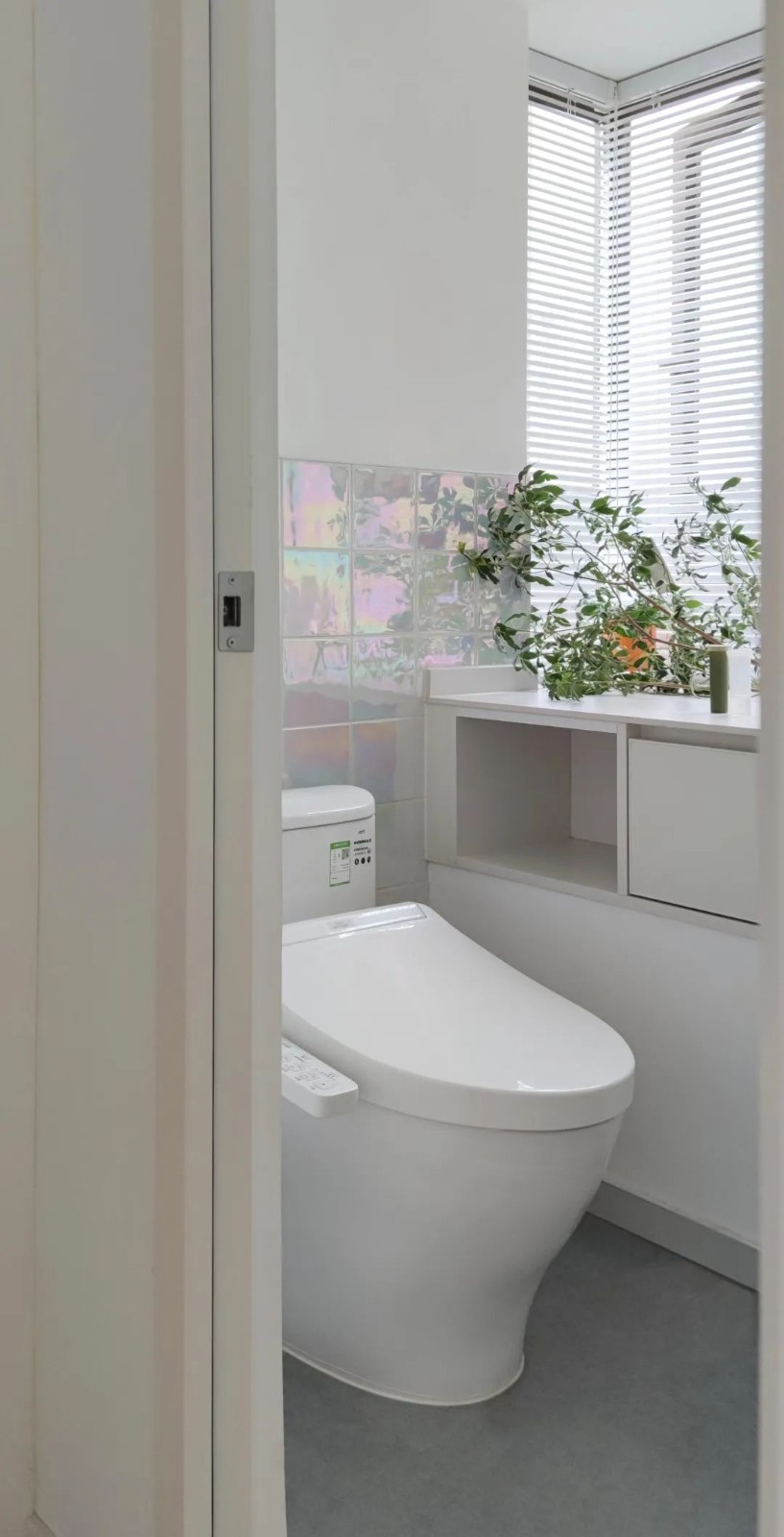 沒有淋浴,貼半墻的磚就足夠了, 選擇了白色的貝殼小磚,表面質(zhì)感很nice, 隨著不同的光線會折射著美妙的光澤, 使素凈的空間更多一絲精致感。