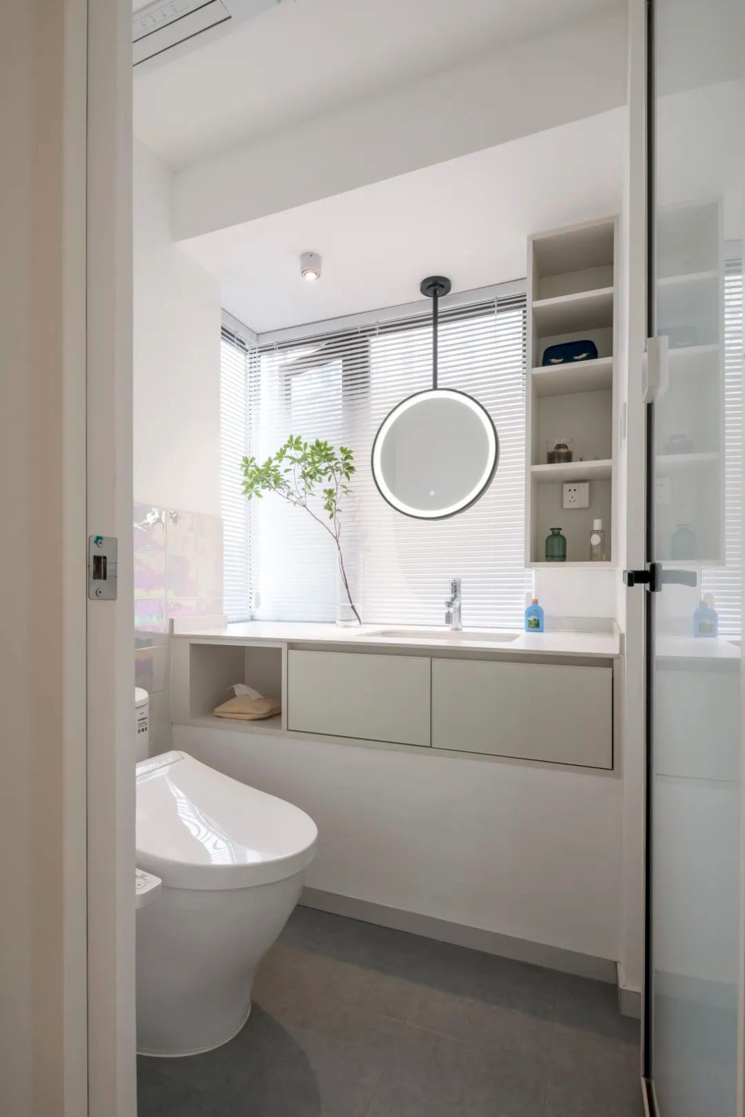 主衛(wèi)在飄窗上設計了洗手盆, 充分提高飄窗利用率, 左側(cè)預留了專門放紙巾盒的凹位。