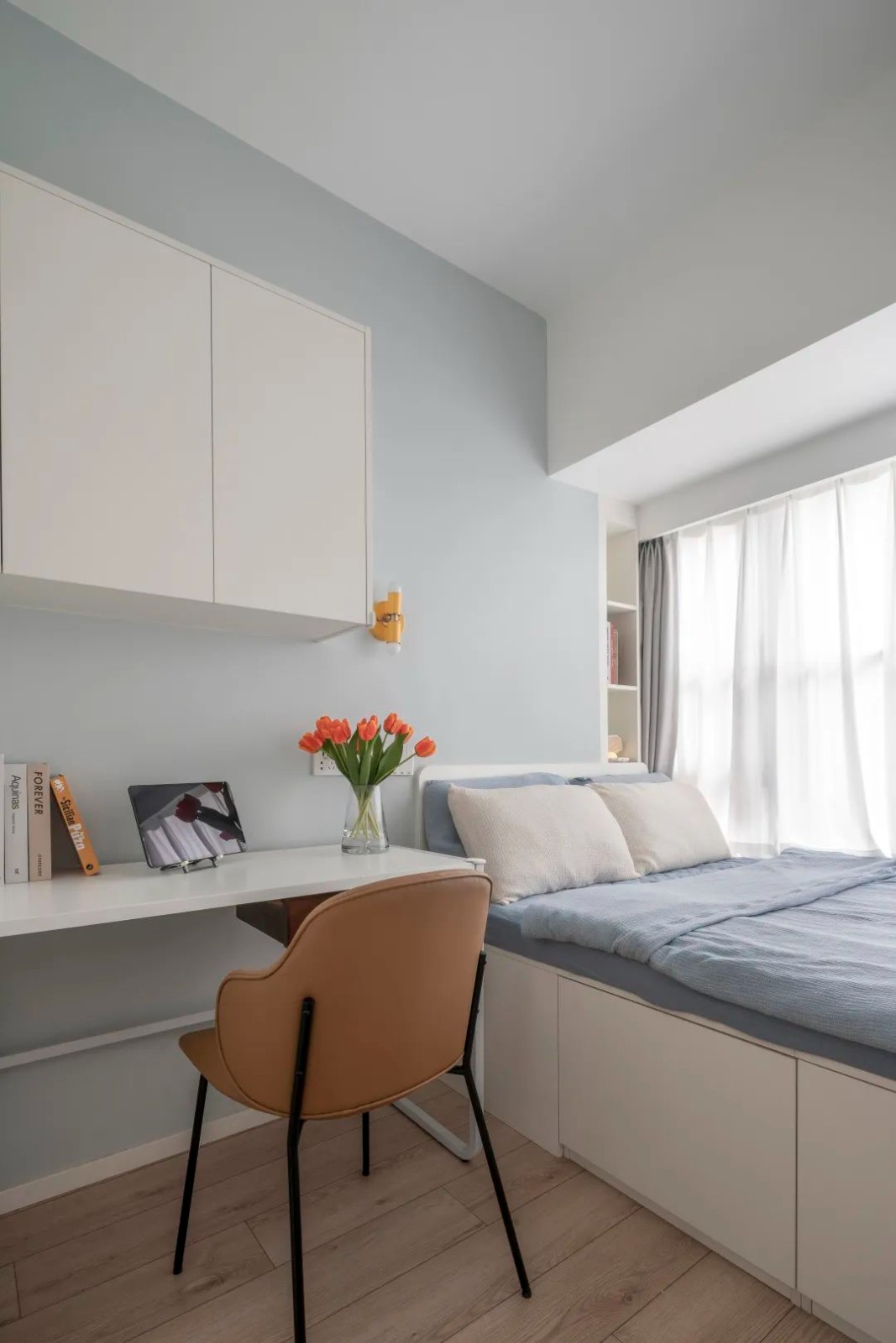 給小朋友的預留的房間, 整體采用了治愈系的淡藍色, 這種溫柔又包容的顏色有助于滋長想象力, 讓人自然聯(lián)想到天空?,海洋,外太空~ 床邊放置了一個簡潔的書桌, 目前可以作為屋主的辦公區(qū)域, 將來也方便小朋友看書學習, 書桌上方是一個白色懸空儲物柜, 床的底部也增加了儲物柜。