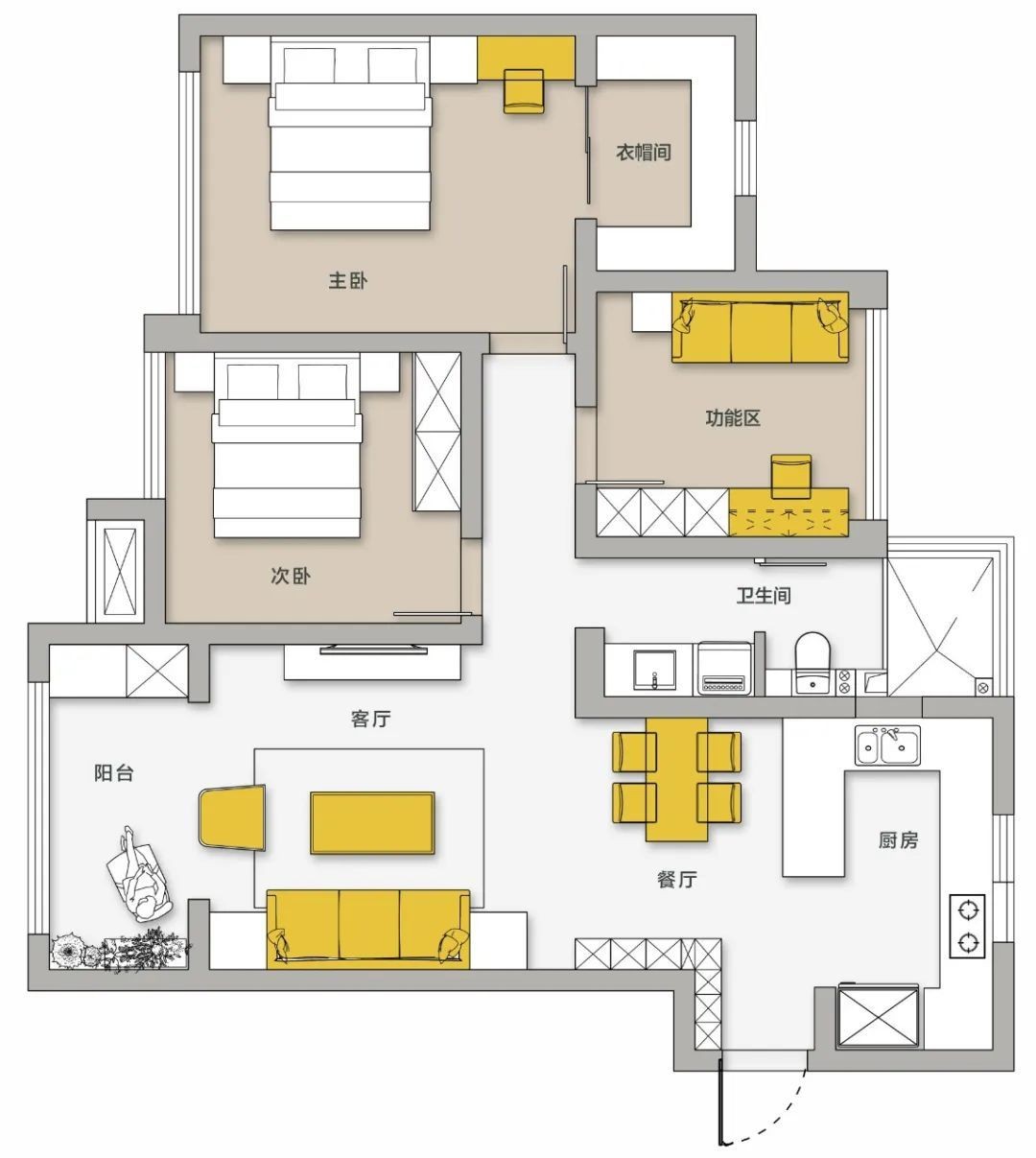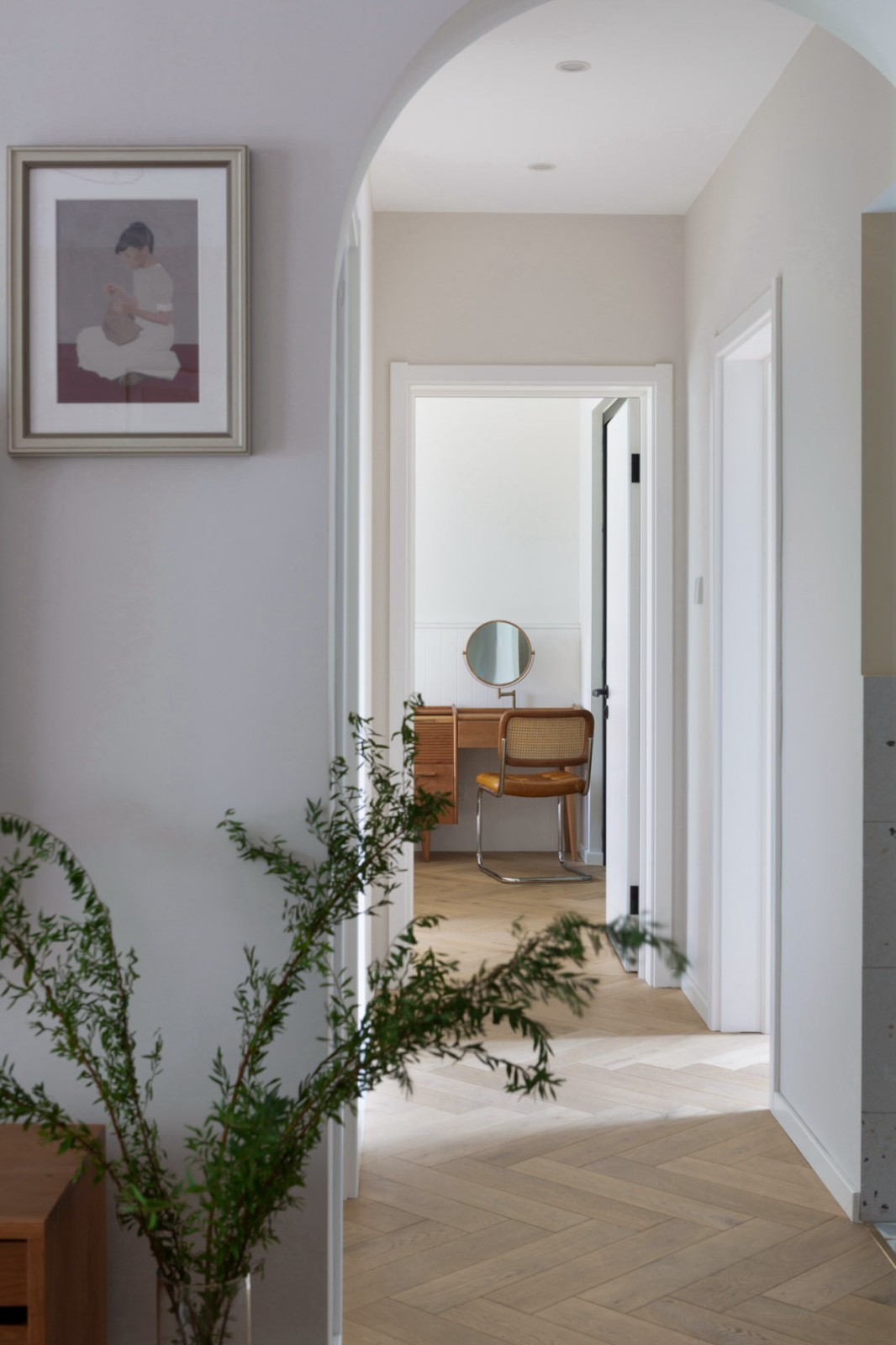 拱門造型在增添空間儀式感的同時,經(jīng)次臥、多功能房、衛(wèi)生間引入的自然光線,賦予由外向內(nèi)的延伸感更有趣的意味。
