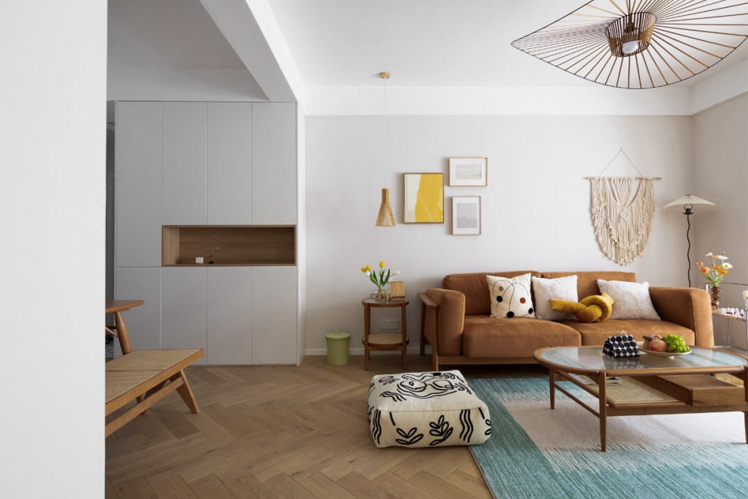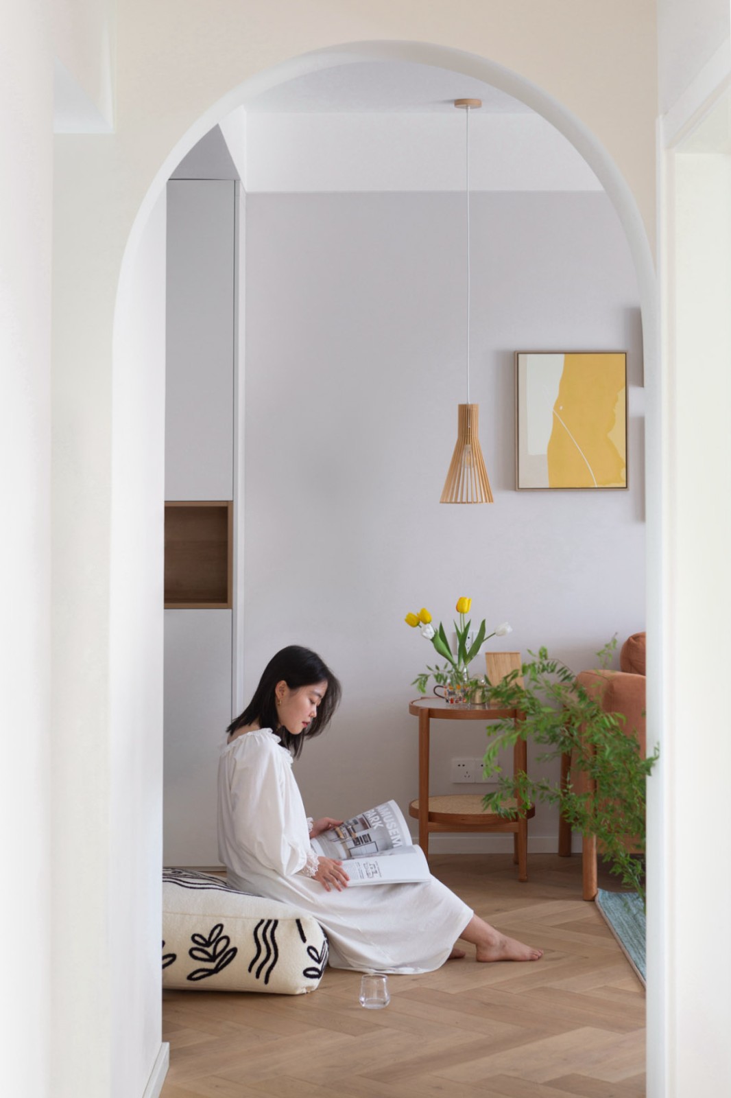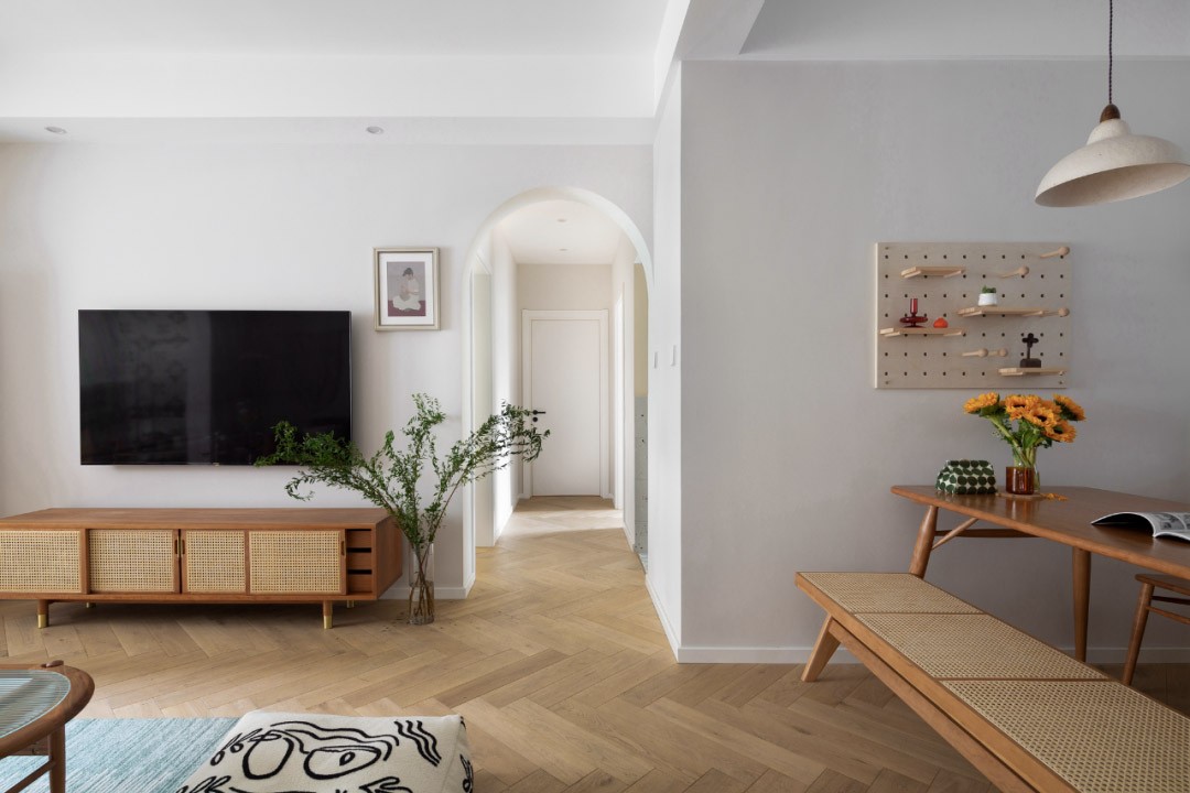這是屋主的結(jié)婚新房,她喜歡自由愜意沒有拘束的生活方式,希望在邁進(jìn)玄關(guān)的那一刻就能放下所有疲憊。這里仿佛像她擁有的一方容器,承載和展示著內(nèi)心所有的可能性,在等待中感受生活給予的美好。