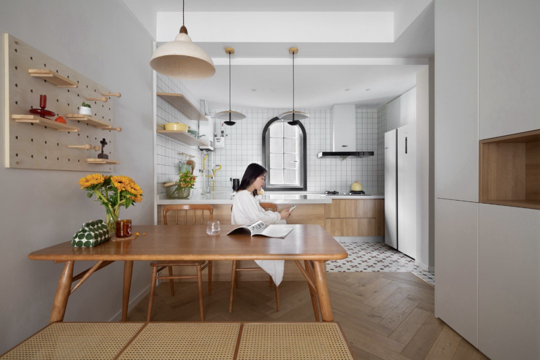 生活中的煙火氣大多是由餐廚承擔(dān)的,柴米油鹽,一日三餐。 拆除原本的墻體后,餐廳與開放式廚房在動線上形成了一塊互動密切的區(qū)域。除了備菜臺面,還設(shè)計了島臺作為功能補(bǔ)充。