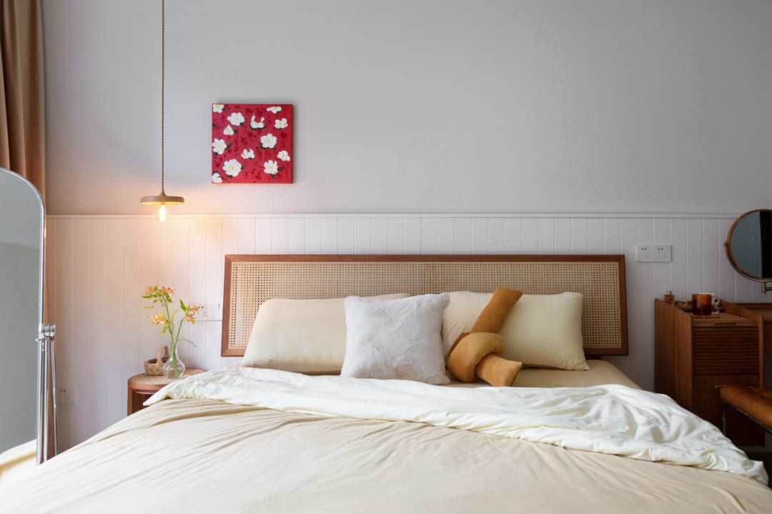 主臥背景墻的木頭材質(zhì)營造出的氛圍能夠帶來安全感,配以藤編材質(zhì)的床、柔軟的布藝、溫馨的吊燈,共同糅雜散發(fā)出度假般的愜意感受。