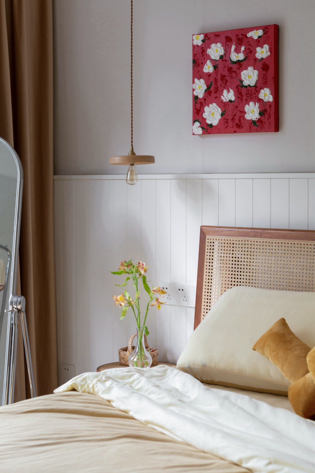 紅色的裝飾畫熱情而濃烈,代表著屋主對生活的的熱情,畫中的花與床頭的植物相互呼應(yīng)。