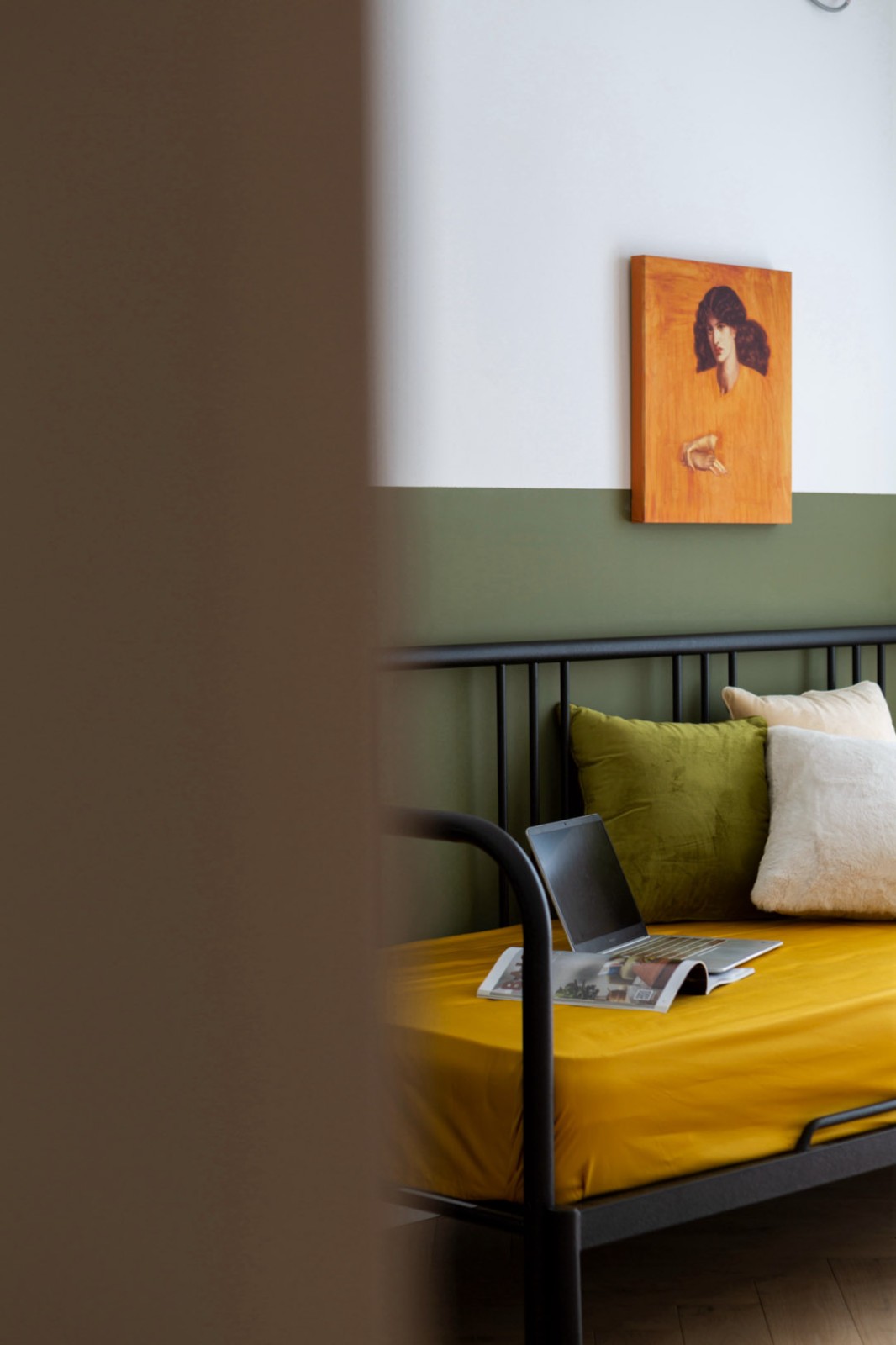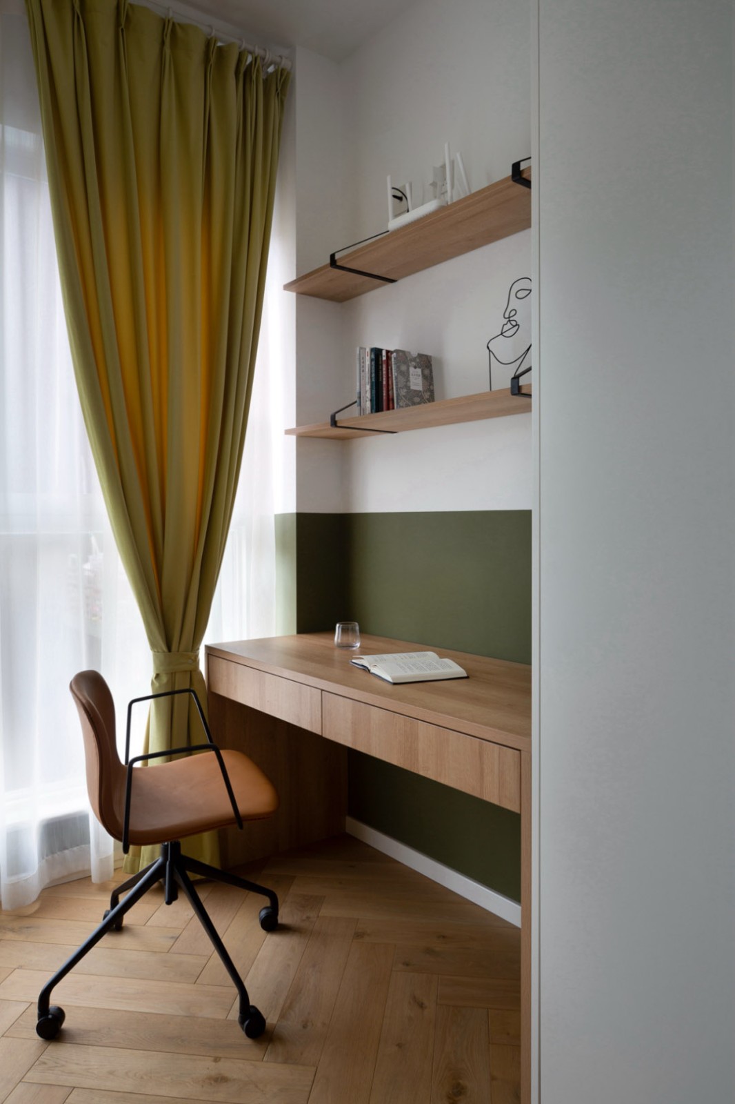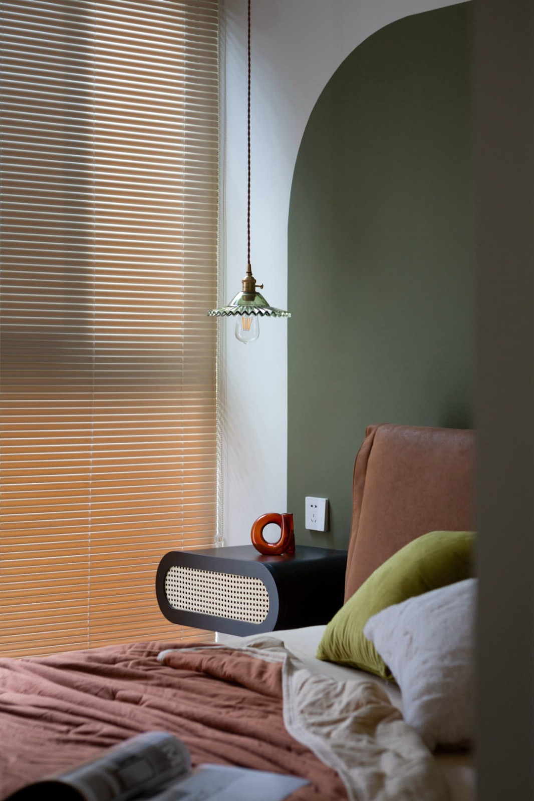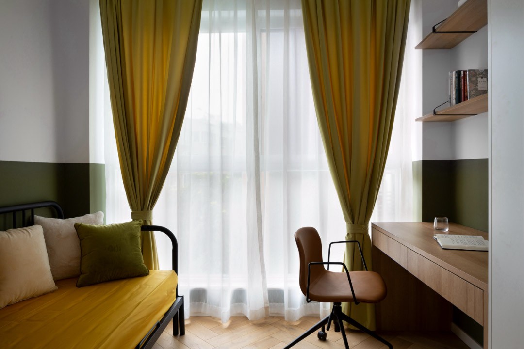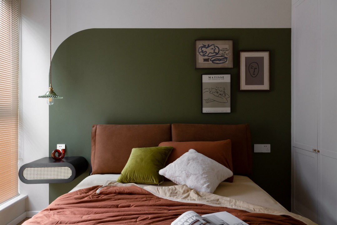 次臥分色墻使用雪松綠,與百葉窗搭配,為客房打造出幽雅的氛圍。