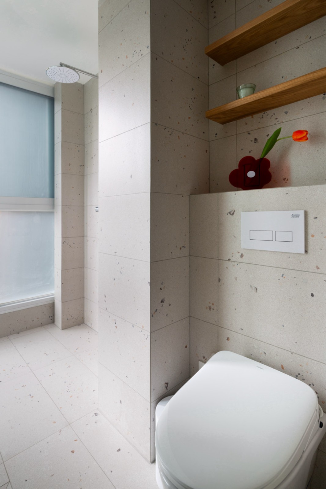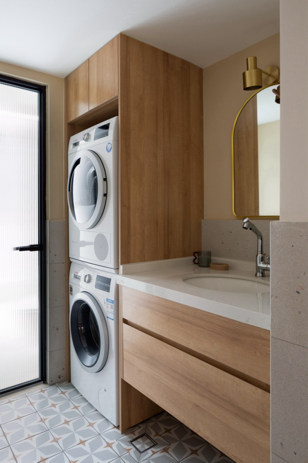 重新整合衛(wèi)生間與生活陽臺之間的關(guān)系后,原始的收納問題及干濕分離都得到解決。