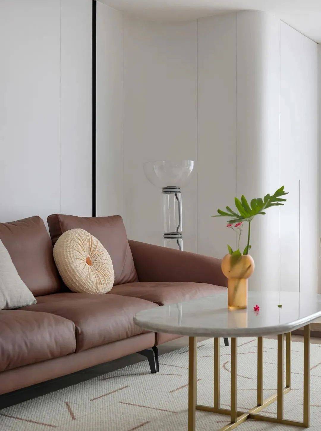 棕色皮面沙發(fā)搭配素雅的墻面,原木桌角的茶幾,綠植給空間增添自然氣息,弧形轉(zhuǎn)角設(shè)計(jì),里面做收納柜,讓空間更加美觀靈動(dòng)。