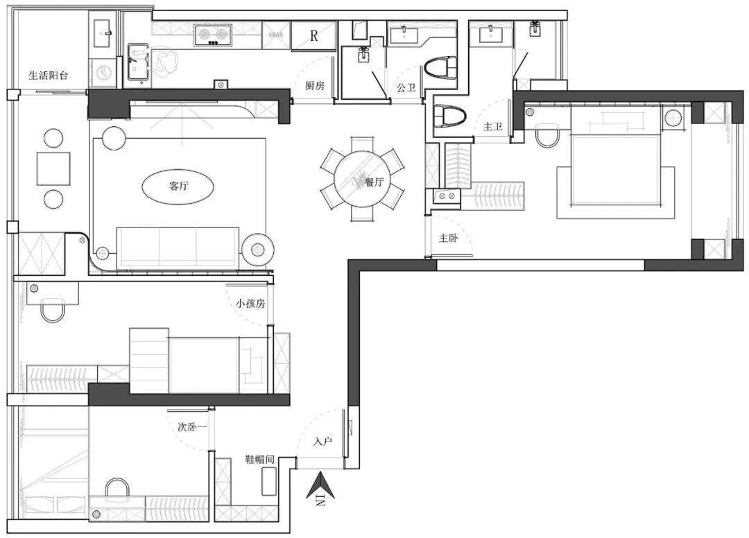 本套案例為異形戶型,格局只有兩側(cè)有采光條件,故而分別將臥室設(shè)計(jì)在兩側(cè),四個(gè)陽臺(tái)設(shè)計(jì)給空間提供充足采光。