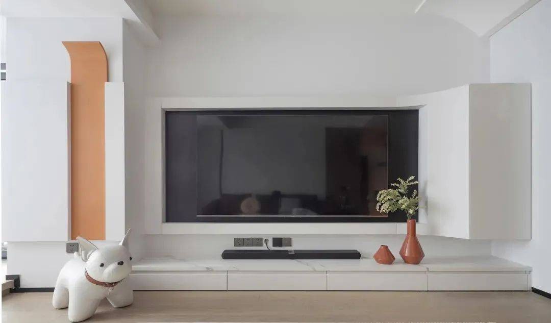 電視背景墻大面積留白,陽臺(tái)外拓,橫梁外露,巧妙將梁體加之不同層次和形狀的疊化設(shè)計(jì),弱化梁位的同時(shí)又能起到美化裝飾的作用。