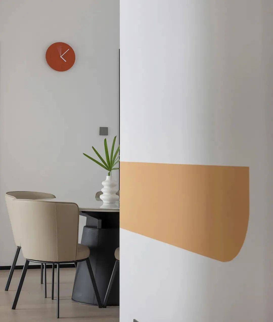 白色調(diào)的空間搭配奶茶色餐椅,舒適淡雅的色彩讓人心曠神怡,入戶過道延伸區(qū)的墻面用橙色跳色點(diǎn)綴,活躍空間氛圍。