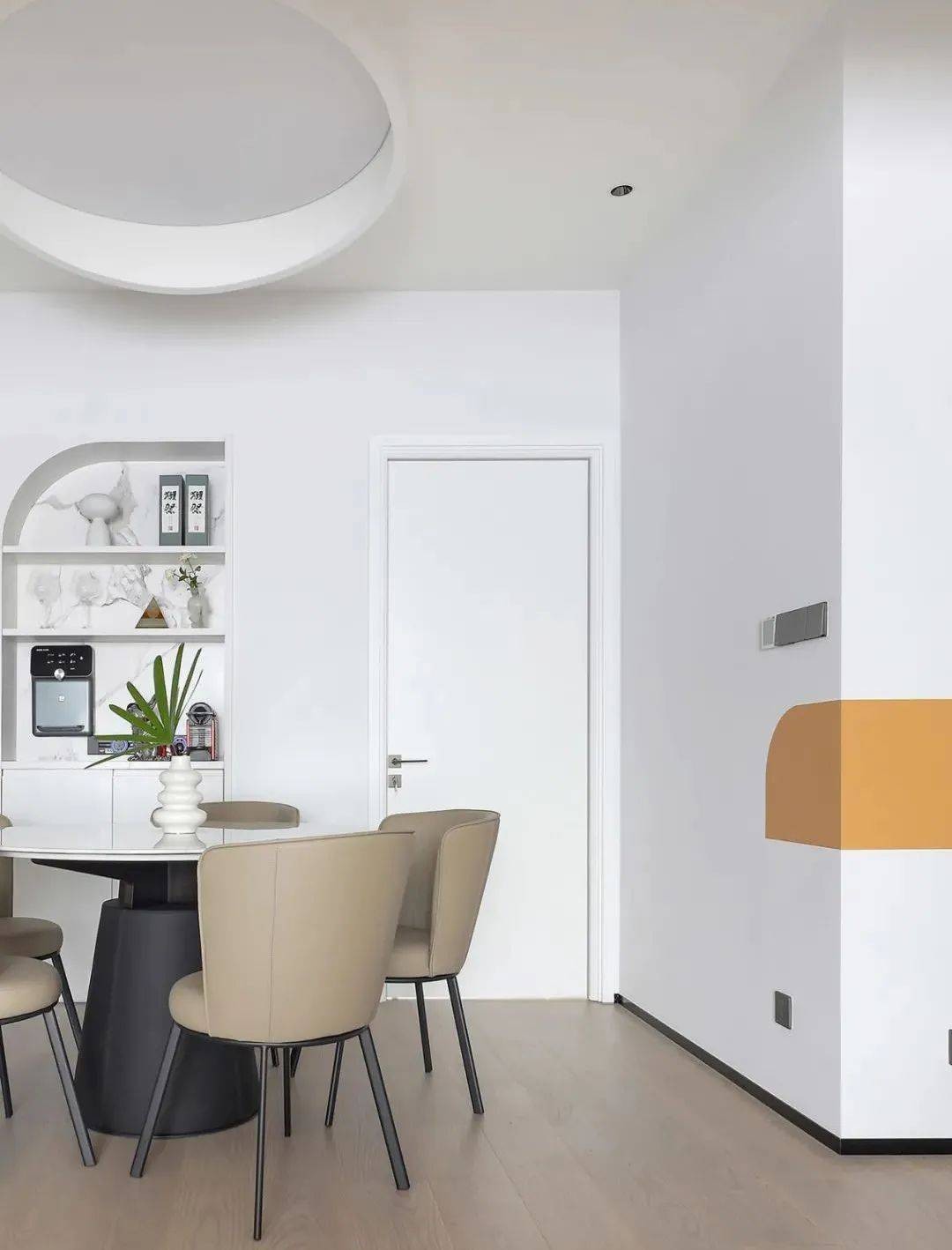 餐廳選擇黑白相間的圓桌,墻壁內(nèi)嵌半弧酒柜。圓弧吊頂設(shè)計(jì)賦予空間一抹律動(dòng),拉伸了空間層高。主臥門隱形處理,讓空間保證工整。