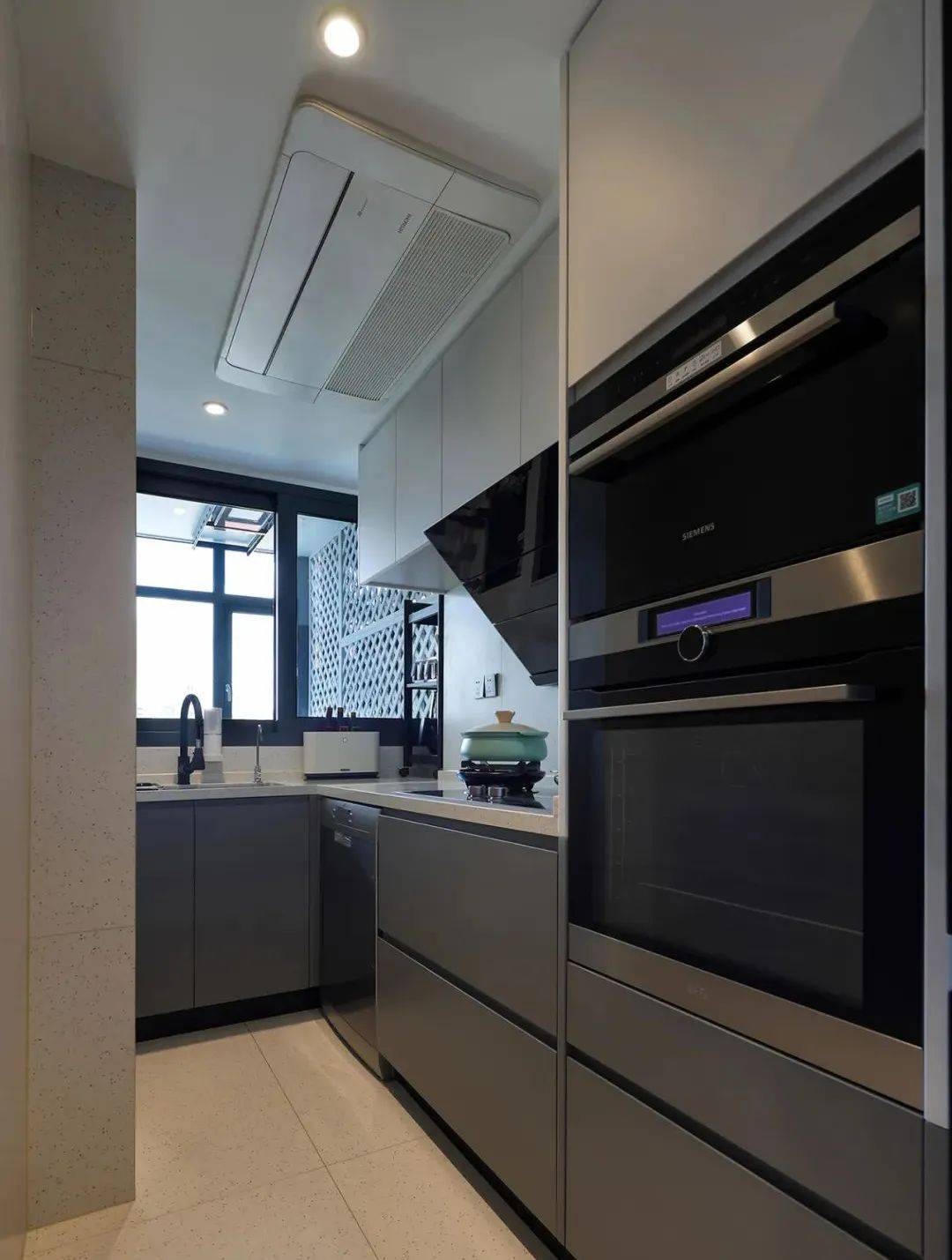 廚房灰色系空間,無拉手面板設(shè)計(jì)+內(nèi)嵌家電,方便日常生活需要。加入暖色系燈光,構(gòu)建起此空間冷暖平衡的韻律。