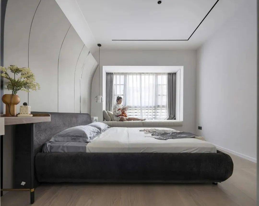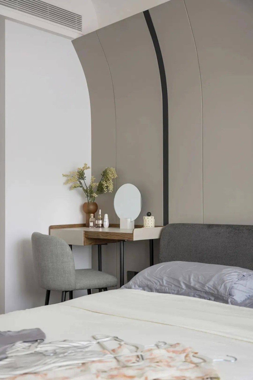 主臥,床頭背景延續(xù)弧形元素,碳灰色床體富有質(zhì)感。頂面磁吸燈為主光源,燈帶做輔助光源,帶回更好安睡的柔軟氛圍。