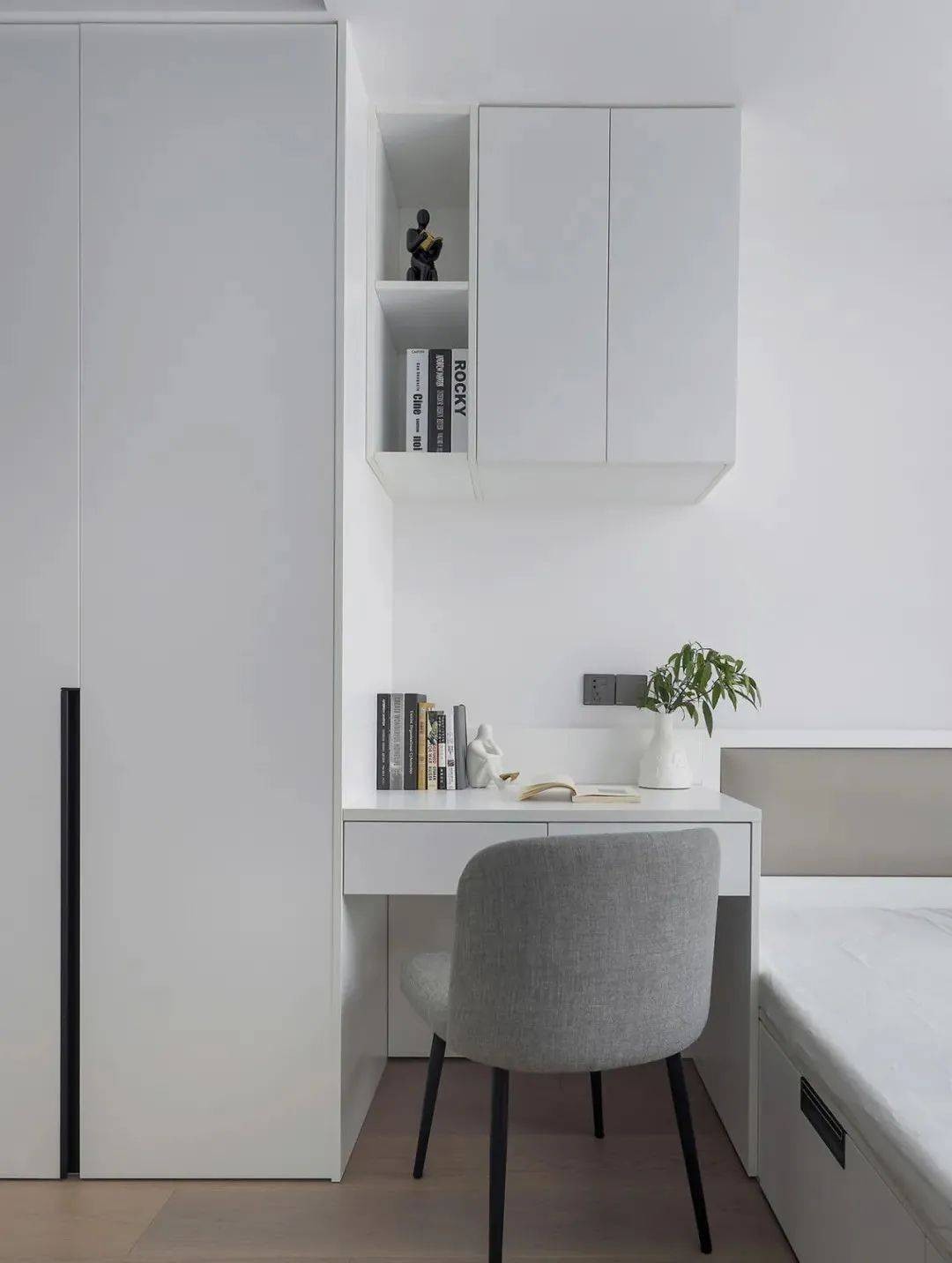 次臥衣柜延伸書桌替代床頭柜,上方增設(shè)一組吊柜滿足儲(chǔ)物需求。一邊安排榻榻米,塑造簡(jiǎn)潔干凈的空間感,簡(jiǎn)約卻十分溫暖。