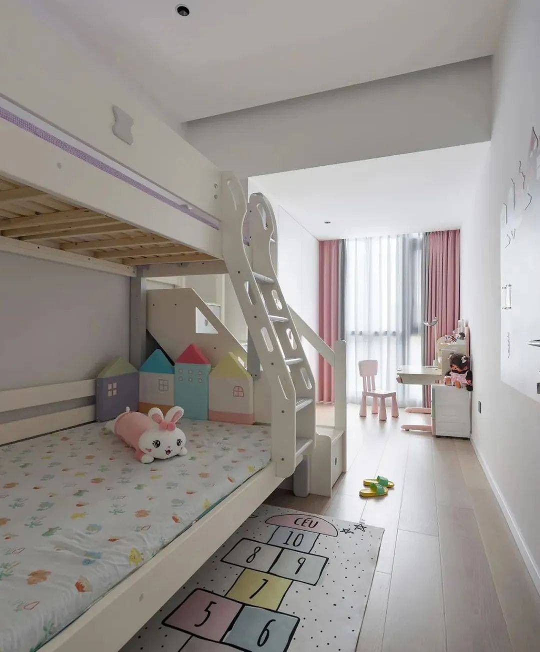 兒童房定制高低床,充分利用立面空間,讓孩子有個(gè)舒適的休息空間。同時(shí)預(yù)留出其他空間區(qū)域,滿足游戲玩耍區(qū)、學(xué)習(xí)區(qū)的功能。
