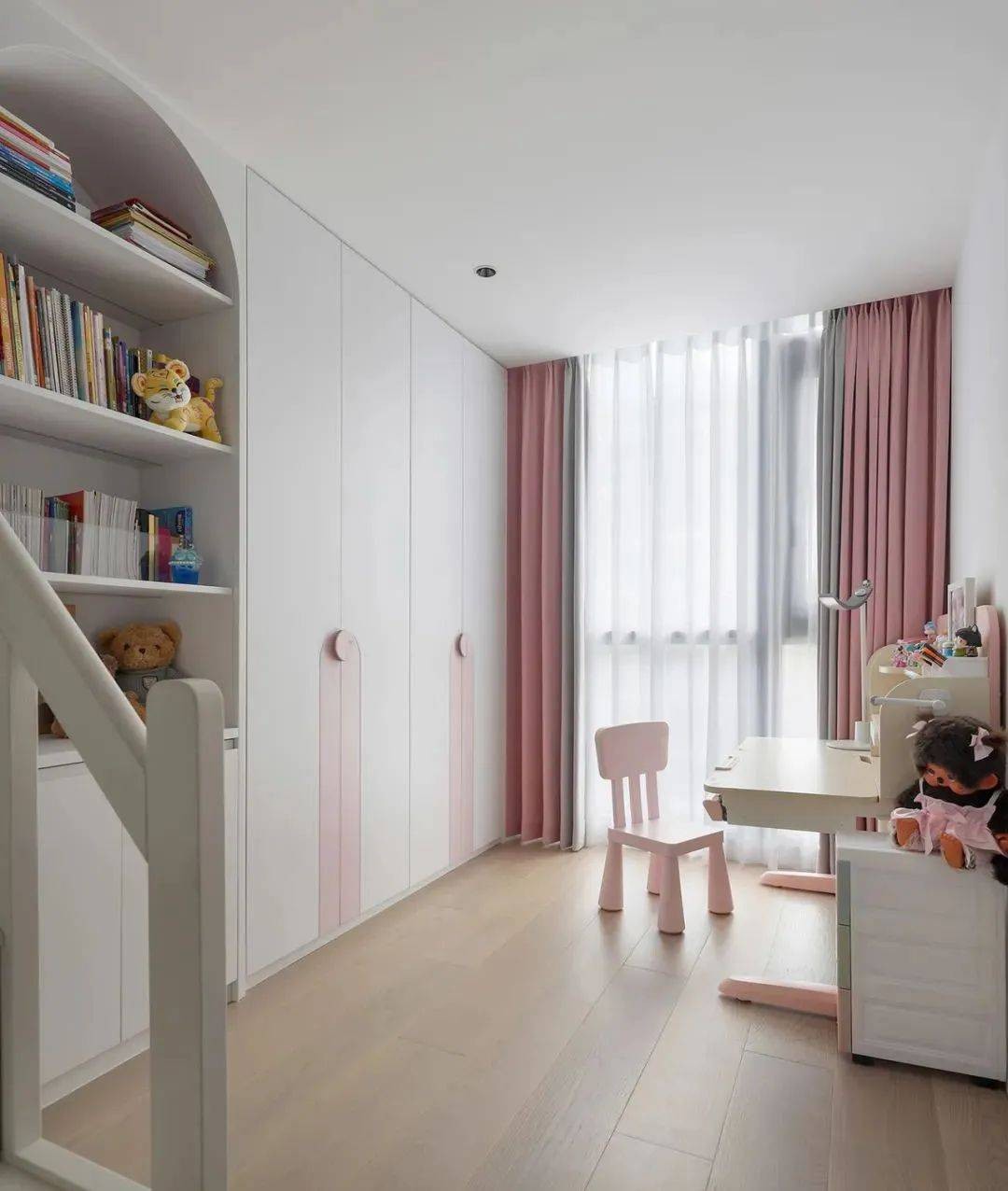 室內(nèi)側(cè)墻打造書柜+衣柜結(jié)合的多功能組合柜,開放式半圓弧書柜,擺置孩子喜愛的書籍繪本,靠窗設(shè)立簡(jiǎn)約書桌,粉嫩的配色浪漫溫馨。