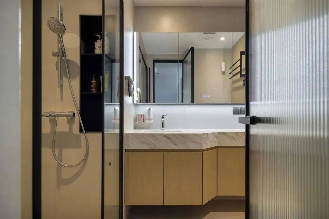 衛(wèi)生間以玻璃移門隔開區(qū)域,選用仿砂巖磚鋪貼至整個(gè)空間,原木色懸空浴室柜搭配白理石臺(tái)面,淋浴區(qū)設(shè)置壁龕,細(xì)節(jié)處體現(xiàn)生活