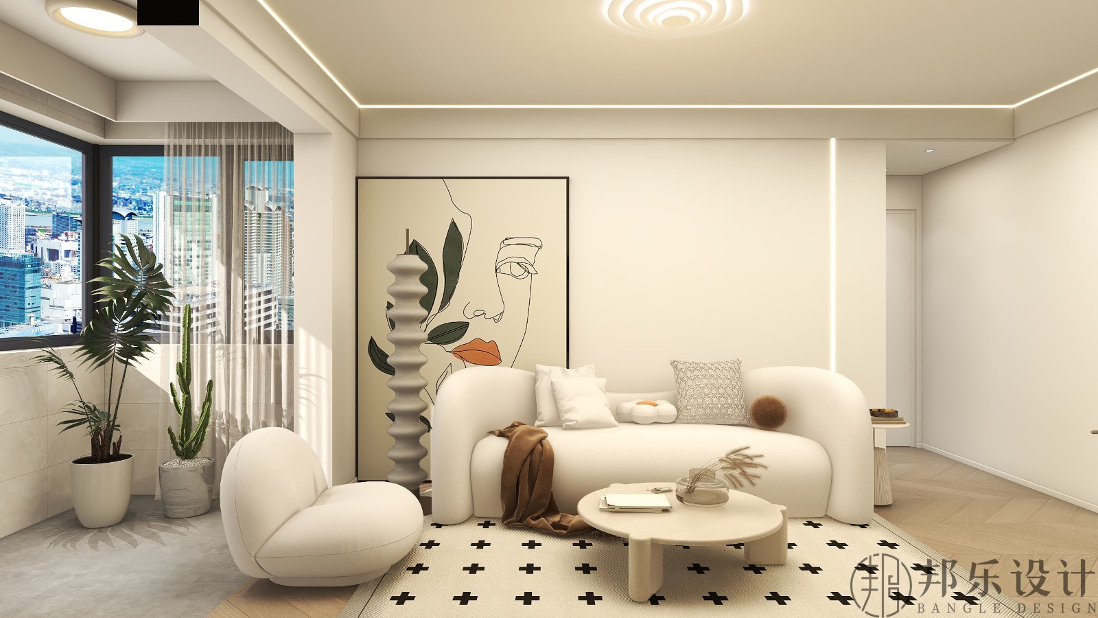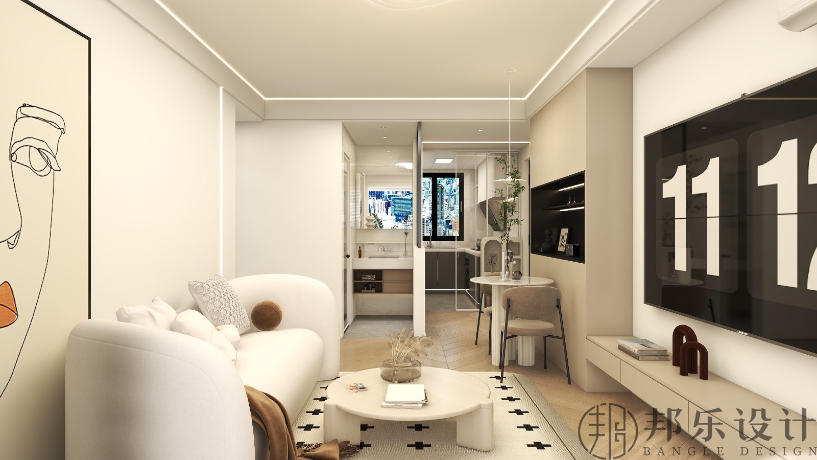 客廳整體色調(diào)以白色和米色的暖色調(diào)為主,空間通透干凈