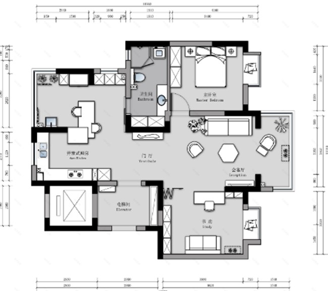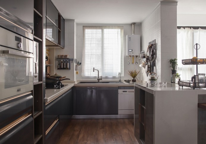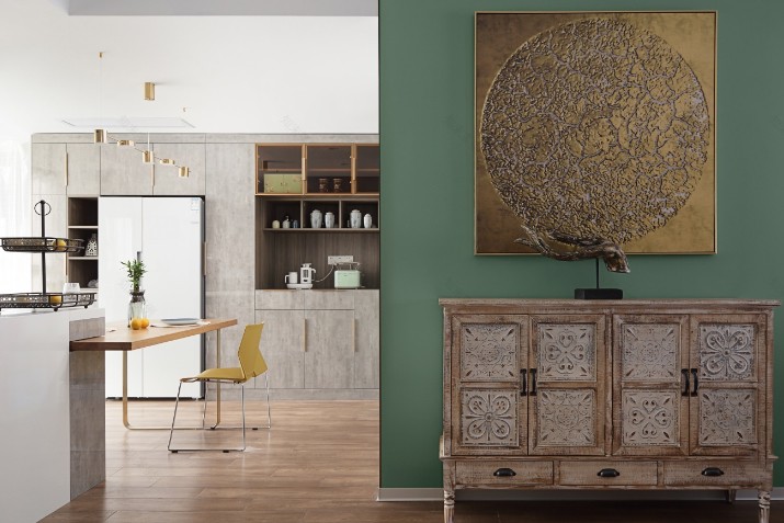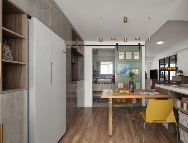 中島吧臺和廚房的組合形成就餐交流空間是本案一大特色,吧臺既可以充當料理臺,又能夠用作餐桌,與頂部銅質吊燈一起,打造出簡約美學,時尚又前衛(wèi)。廚房灰色紋理的柜門,與餐廳灰色的柜體,增添了很多藝術氣息。開放式廚房,因為面積有限,操作臺面和收納空間都不夠,而中島的加入不僅可以增加操作臺面空間,還將廚房和餐廳融為一體,收納空間大一倍。