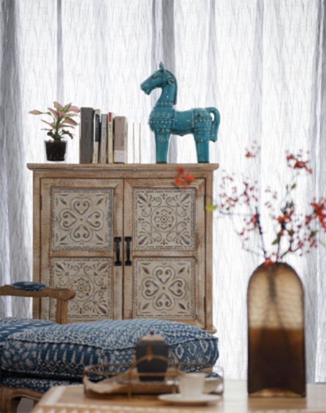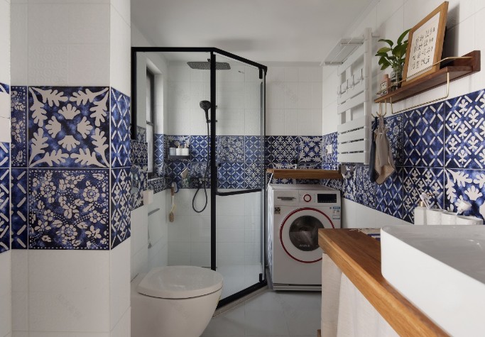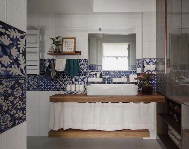 衛(wèi)生間的花磚腰線拉伸的空間的縱深感,淡藍色,白色和原木色的搭配讓人心曠神怡。波普風的藏族花磚,搭配亞麻的純色窗簾,和那些桌面、窗臺、洗手盆、地面的原木色,看上去群魔亂舞實則不經(jīng)意間的隨心而為。