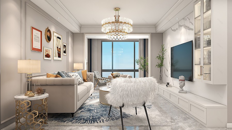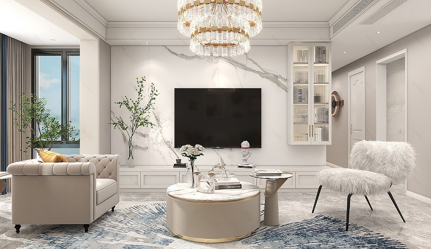 客廳以超大落地窗引入充足光線,象牙白主題色既是優(yōu)雅的烘托,又能與光線充分配合,以此提升室內(nèi)明亮度與舒適感。再加入或棕或藍的軟裝配飾,和背景墻中的組合畫框裝點,讓空間層次感更加強烈。