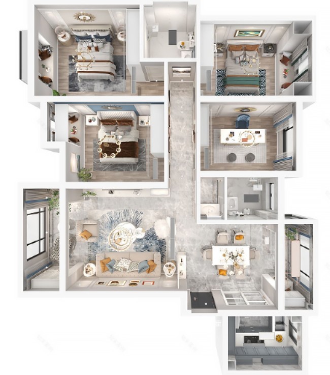 吊燈的出現(xiàn)為空間帶來奢華搭配,同色系的延伸讓空間更加整體化。臨窗一側(cè)布置綠植,是自然氣息的彌漫;靠走道一側(cè)則打造懸空收納柜,在玻璃門折射出若隱若現(xiàn)的光芒下,這里存放書籍。