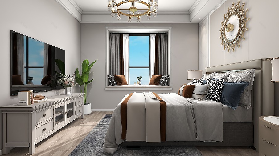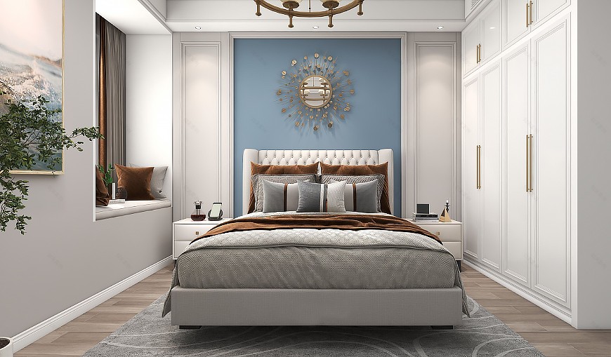 象牙白柔和高雅,充分融于主臥之中,舒適且溫馨的生活氣息。床品搭配深藍色與棕色,增添視覺層次感,背景墻布置一塊歐式掛鐘,輕奢格調(diào)不言而喻。加入角落綠色落地盆栽的點綴,自然縈繞下,生活也變得輕松自在。