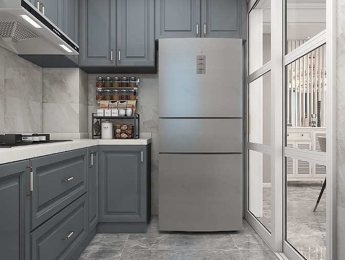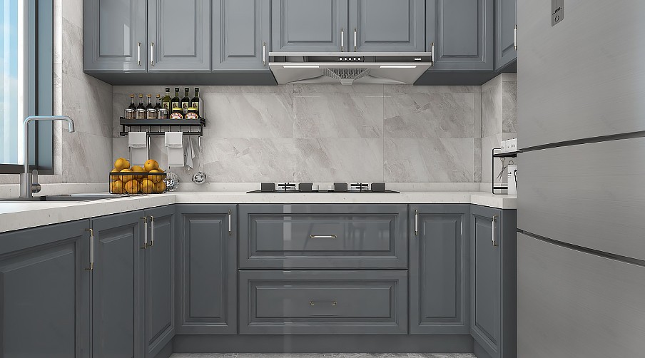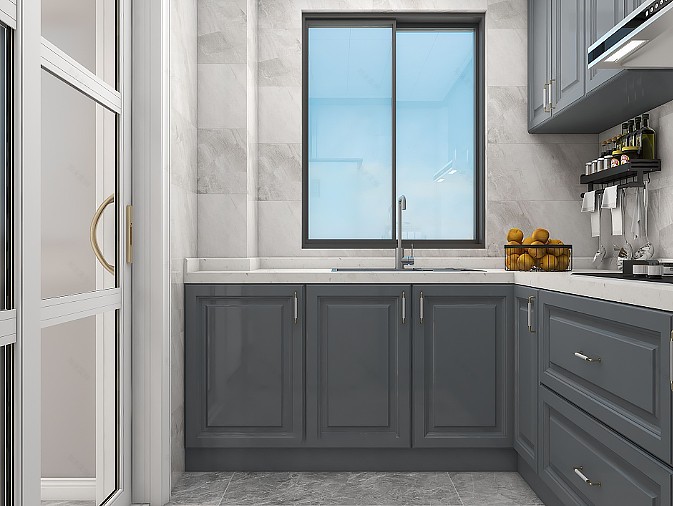 進入廚房,灰紋墻磚搭配煙灰藍櫥柜,雅致但不失時尚的美韻。冰箱嵌入式在進門右手邊,配合空間的U型布局,讓讓日常烹飪范圍也更加靈活自如。