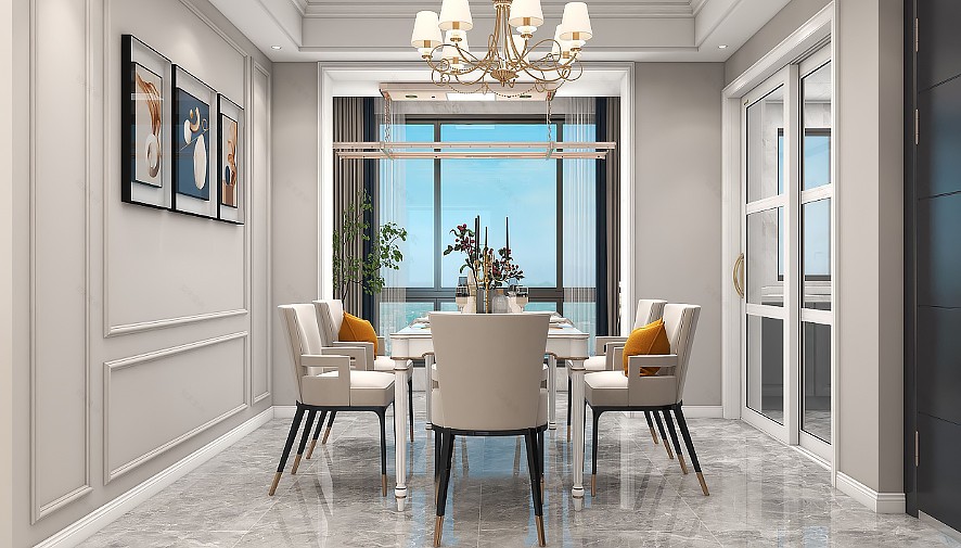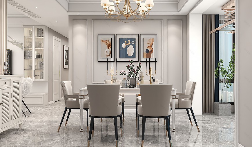 餐廳的布置簡約華美,其純色若是顯得過于單調(diào),加入石膏線的點綴則多了份雅奢氛圍;美式吸頂?shù)鯚粼诮饘倬€條的映襯下,讓用餐變得溫馨十足,能夠令人時刻保持愉快心情。