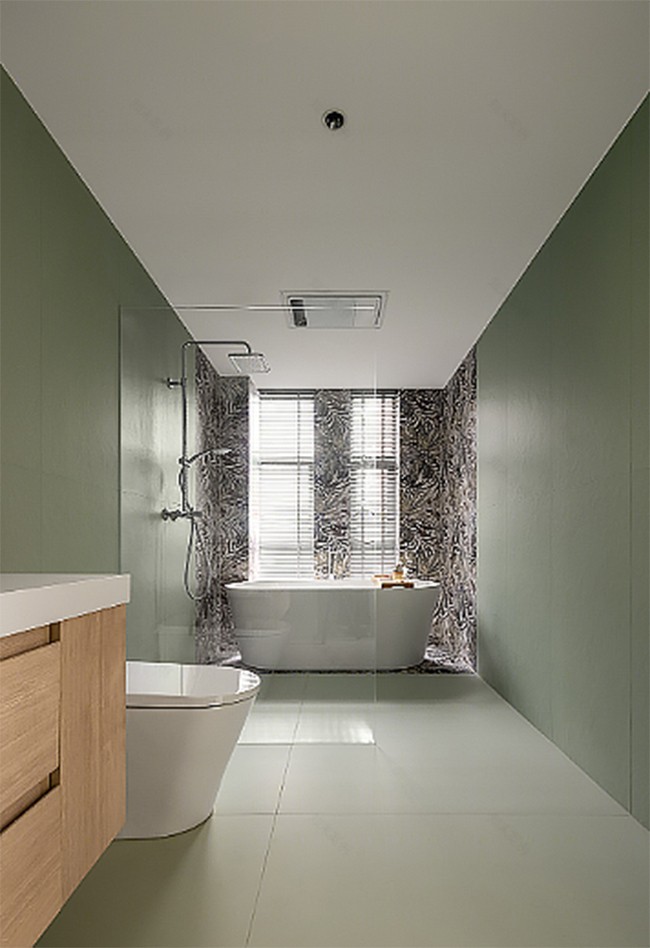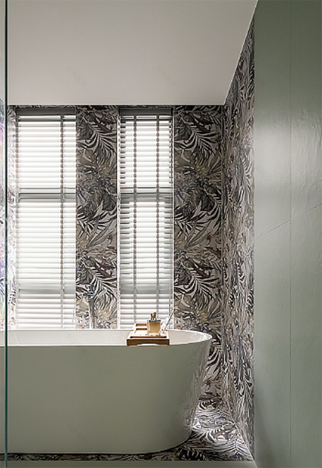 只此青綠,緩緩鋪陳衛(wèi)生間的靜謐情緒,轉(zhuǎn)角處配合葉狀花紋打底,光影變換從容各異。