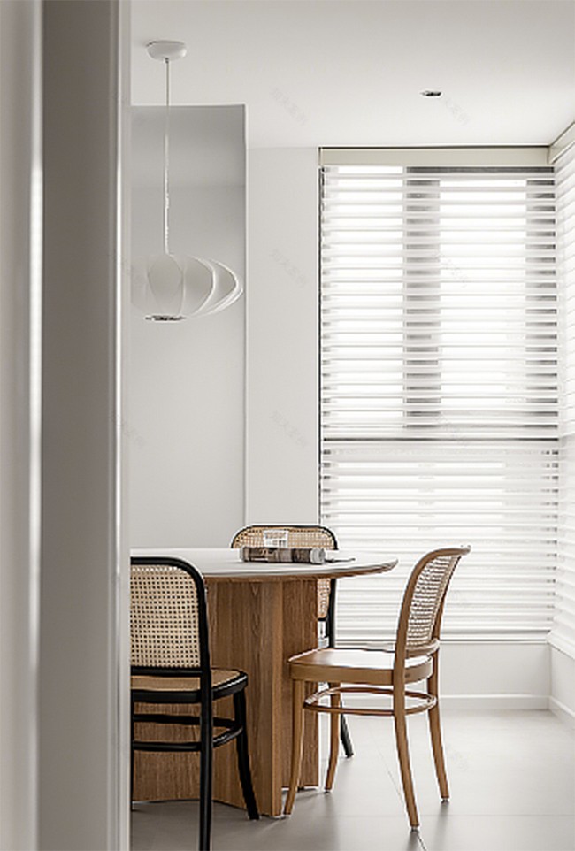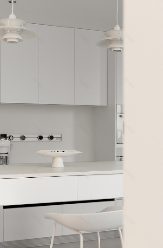 配色因為要出原木的溫馨感,將原木色和白色進(jìn)行搭配。為了協(xié)調(diào),采用大面積白和少量原木進(jìn)行點綴。點綴重任就留在了臺面和置物架上。