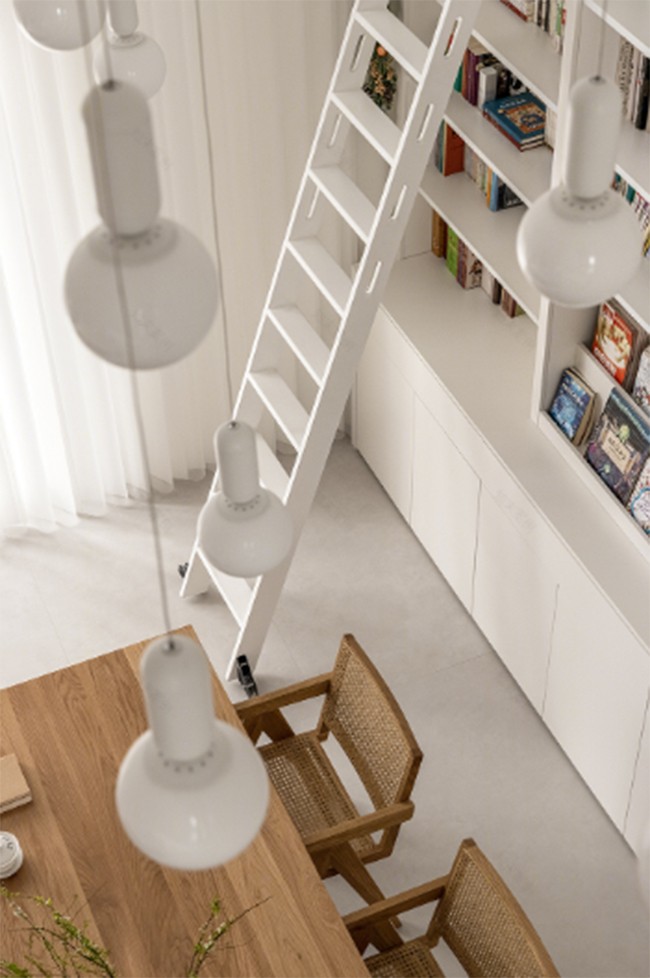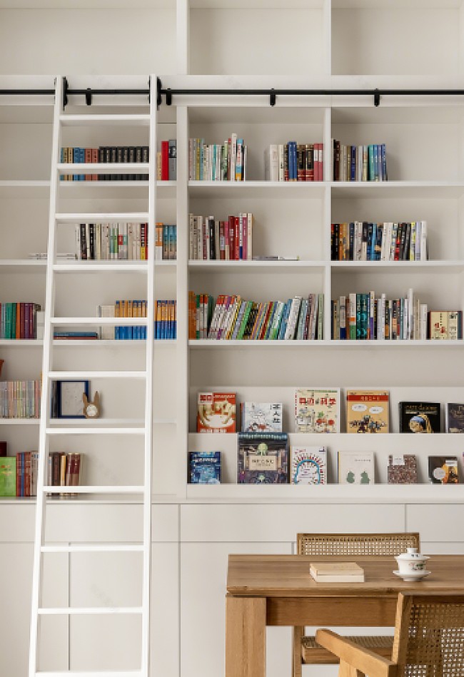 是一個多功能復(fù)合空間,挑空設(shè)計讓視覺豁然開朗,整面書架墻應(yīng)勢而生、層次疊級。人在其間,翻開一頁頁紅塵往事,各有所安、亦有所得。