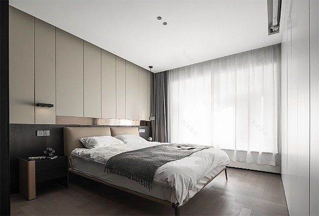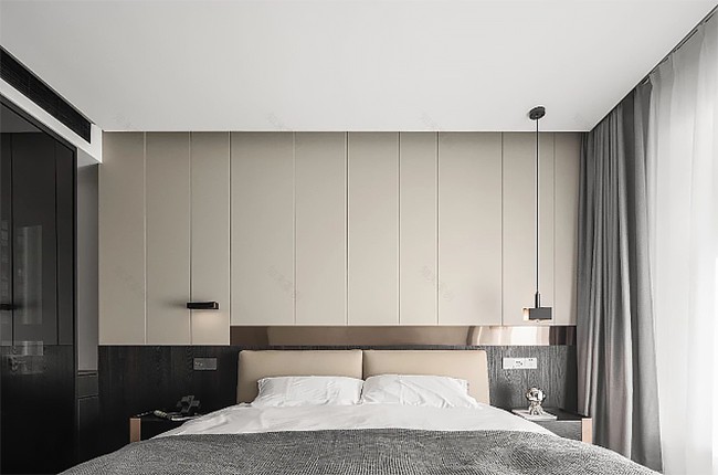 臥室背景墻以深藍(lán)色為主,營(yíng)造寧?kù)o深邃的休憩氛圍,灰色床上用品,慵懶復(fù)古風(fēng)感覺(jué)。