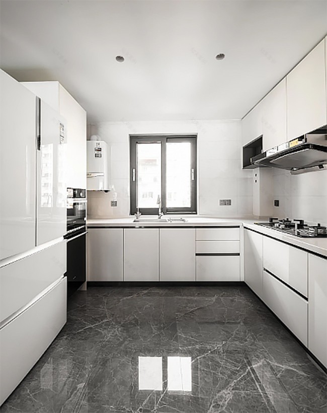 廚房L型設(shè)計(jì)既能合理利用空間,以白色為主,讓廚房干凈整潔。