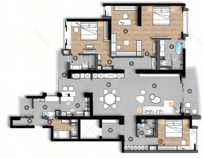 主要是客餐廳和臥室部分,使空間通透、開(kāi)放,整體統(tǒng)一。 拆除客餐廳之間凸出的隔斷墻,把客廳和餐廳變?yōu)橐粋€(gè)整體區(qū)域,擴(kuò)大客餐廳視覺(jué)面積,看起來(lái)更加寬敞、大氣。 臥室布局以主臥為主,與書(shū)房空間打通,借用走廊和兒童房空間,由縱向轉(zhuǎn)為橫向布局,主臥成為一個(gè)大套間,整個(gè)區(qū)域看起來(lái)更加開(kāi)闊、統(tǒng)一,動(dòng)線也會(huì)更流暢。 靠近玄關(guān)的次臥把配套衛(wèi)浴分隔出來(lái),作為公共衛(wèi)浴,方便日常生活,同時(shí)過(guò)道能夠增加