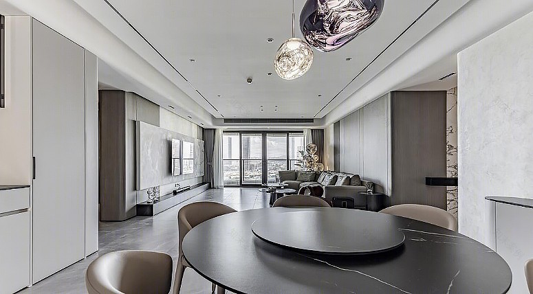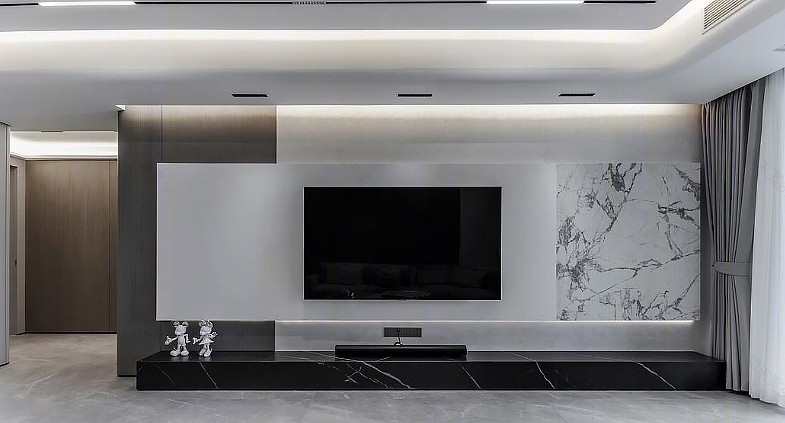 低飽和度黑白灰的質(zhì)感,是很多色彩無(wú)法代替的,恰好極簡(jiǎn)美學(xué)與此完美契合??蛷d摒棄過(guò)多的裝飾,電視墻采用白色微水泥+巖板拼接,搭配黑白根大理石的地臺(tái),使整個(gè)電視區(qū)域看起來(lái)更有層次和質(zhì)感。