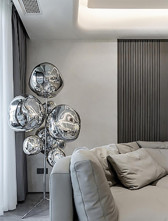 無(wú)主燈設(shè)計(jì)使室內(nèi)光線均勻,空間顯大又通透開(kāi)闊。客廳的燈光分為四個(gè)部分,采用極簡(jiǎn)線條,滿足照明的同時(shí)又有很好的氛圍感;通過(guò)燈光深深淺淺的變化,突出空間的層。
