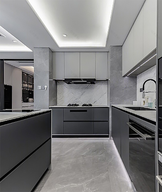 廚房采用L型動(dòng)線布局,側(cè)邊增加了一個(gè)小島臺(tái),安裝電動(dòng)升降插座,可以放小家電,下方有兩層大抽屜,儲(chǔ)物功能大大增加。地柜和吊柜分別為深灰色、淺灰色,色彩的深淺變化讓空間更有層次,視覺(jué)更豐富;吊柜及地柜的底部都嵌入燈帶,使用時(shí)沒(méi)有視線暗角,同時(shí)營(yíng)造出空間。