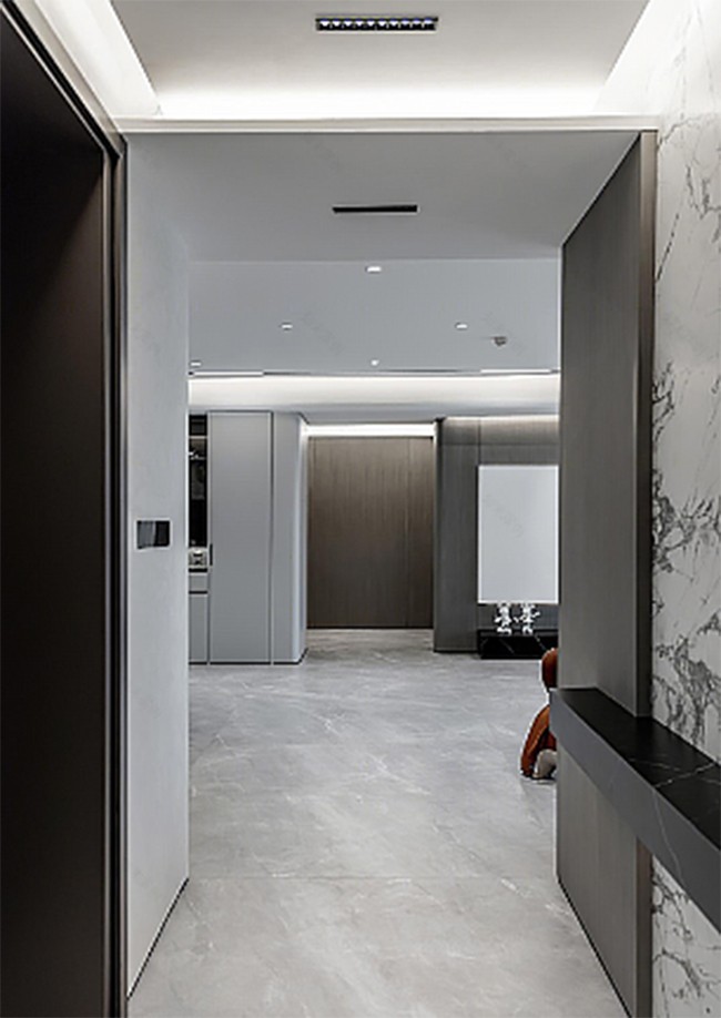正門(mén)是一梯一戶,落塵換鞋區(qū)在出電梯后的入戶花園內(nèi),本來(lái)室內(nèi)沒(méi)必要再設(shè)置一個(gè)玄關(guān),但我們想讓業(yè)主回家有歸宿感,而且也不想浪費(fèi)這面墻的空間,因此設(shè)計(jì)一個(gè)端景作為玄關(guān)空間的點(diǎn)綴。