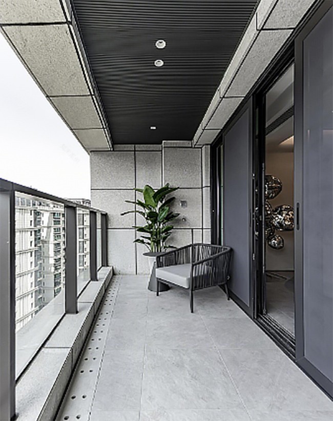 陽(yáng)臺(tái)不封窗,保留休閑、觀景的功能,地磚重新更換與整體色調(diào)相同的灰色系,把原本的地漏封起來(lái),在欄桿邊做一整條的排水孔,避免雨天積水。頂面做了格柵板吊頂,縮短與兩側(cè)的落差,使整體看起來(lái)整潔統(tǒng)一。