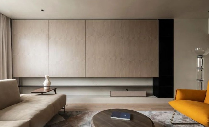 一般是周末過來居住,為保證視覺整潔,客廳采用巴士移門設(shè)計,內(nèi)部安裝電視,開放靈活更為美觀,底部留空 擱板設(shè)計弱化壓迫感,儲物功能強大且視覺效果輕盈美觀。