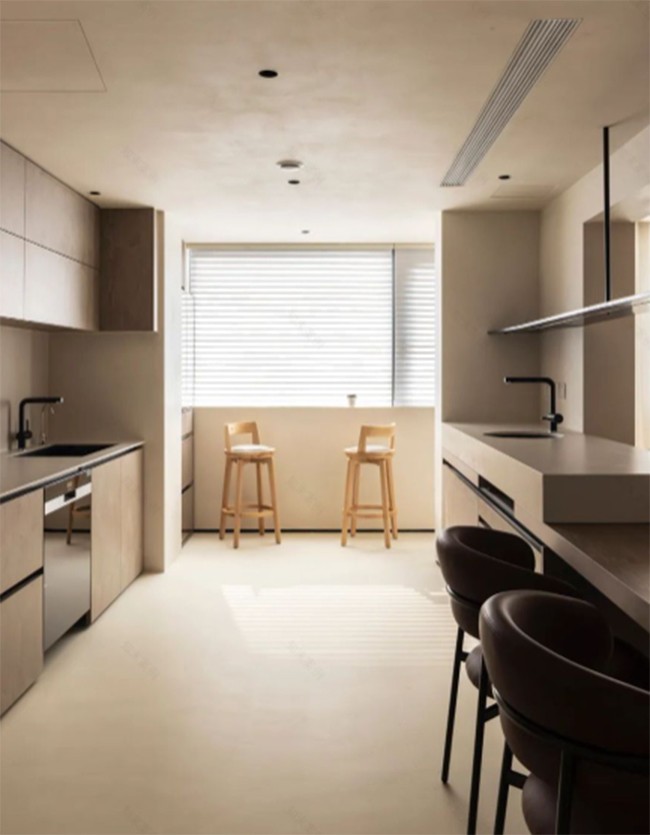 考慮到實際使用情況,餐廚空間不同于客廳鋪貼的木地板,采用微水泥地面,過渡線采用極細(xì)金屬壓邊條收口,保證地面平整度,在視覺上也更顯簡約和質(zhì)感。