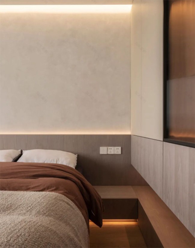 床頭吊頂保留一定留白,內(nèi)嵌線性燈帶,漫反射光線更符合臥室需求,視覺上不刺眼但能保證照明效果。