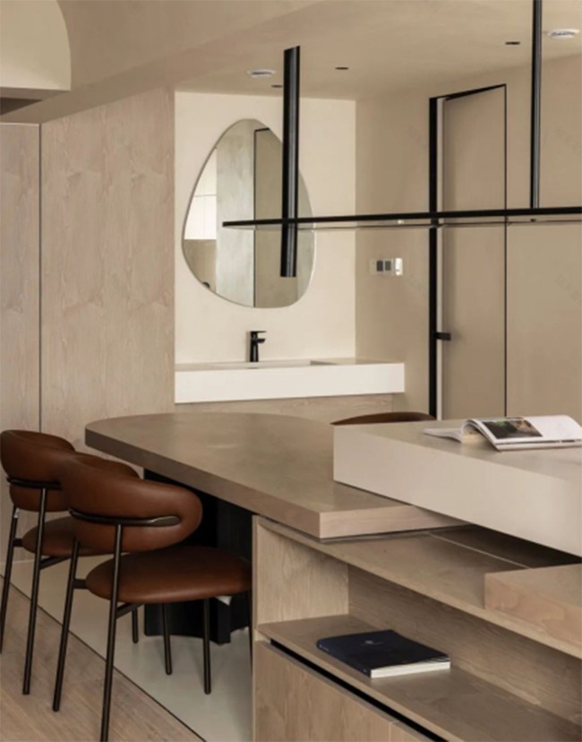 墻地一體,采用米色系微水泥,臺面采用同色系巖板,搭配胡桃木色柜體,不同材質(zhì)配合交錯。打造視覺效果豐富的低飽和度空間,視覺舒緩,氛圍寧靜溫和。