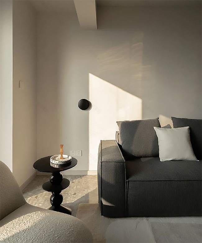 客廳不算很大,考慮到視距問題,擺放電視區(qū)域打造半身電視柜,并延伸至陽臺區(qū)域打造頂天立地柜,增加收納,既滿足了收納需求,也保證了視覺美感。
