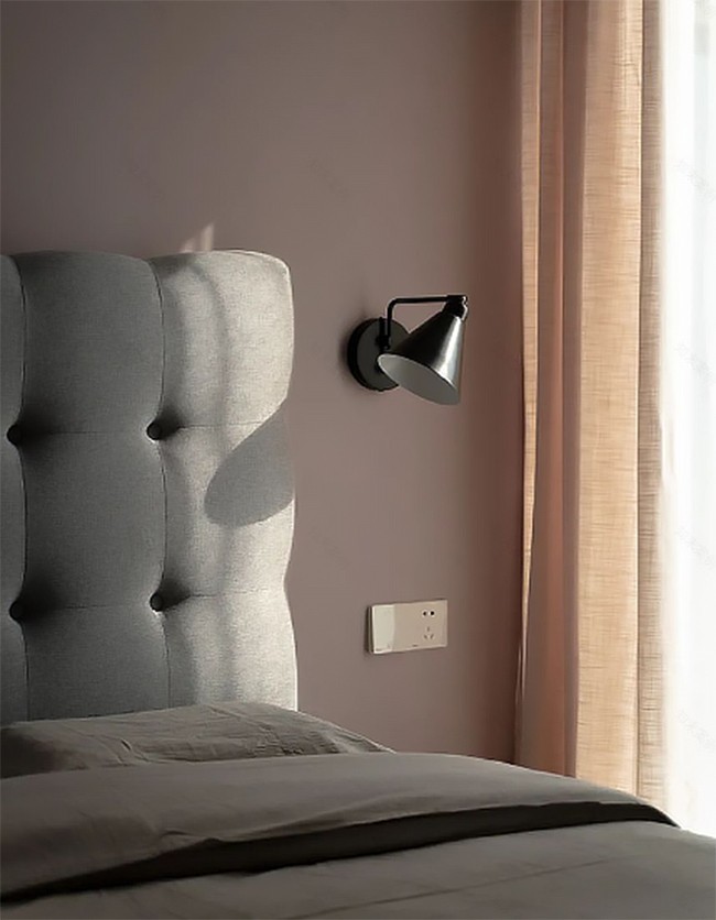 背景墻采用護墻板鋪貼下半墻,深灰色材質(zhì)搭配深色床頭柜,為睡眠空間增加沉穩(wěn)氣質(zhì)。